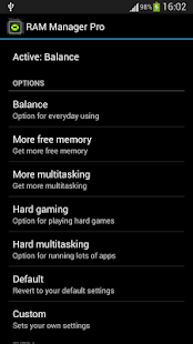 ★Balance - Option which makes your RAM to the best optimization, this option is for everyday using. Use this option when you want to have fast phone without lags.